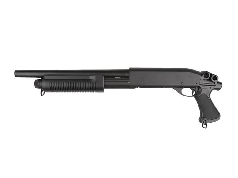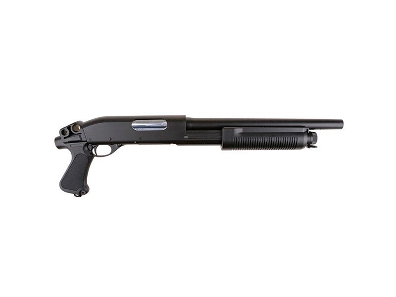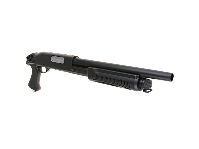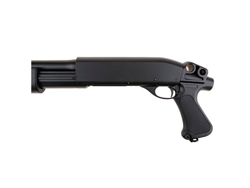 La CM351 de Cyma es una escoeta de muelle potente y realista. Esta replica cuenta con 3 cañones internos. Esto permite disparar 3 Bbs a la vez, lo que es una gran ventaja en el campo de batalla especialmente es las escaramuzas CQB. Las bolas de 6mm se cargan en cartuchos de hasta 30Bbs, el cual se colocan en el hueco de carga de la réplica, lo que le da al arma aún mas realismo.