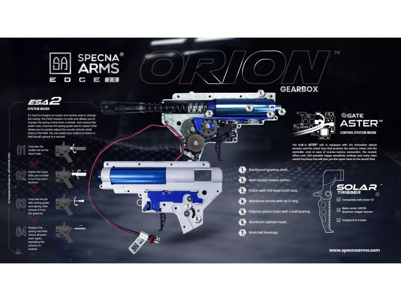 El corazón de la réplica está formado por la caja de cambios ORION, basada en un marco reforzado y equipada con la función de liberación del resorte principal. La réplica cuenta con una serie de piezas de alta calidad desde el primer momento, lo que la hace característica por su fiabilidad y preparación para posteriores ajustes. La caja de cambios ORION está preparada para la cooperación con resortes M140 . En su interior se encuentran elementos como:
