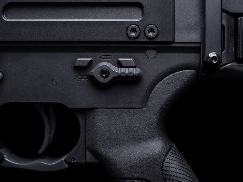 El receptor inferior también es de polímero y acepta todos los cargadores AEG de estilo AR, lo que brinda a los jugadores una gran selección de opciones de posventa. El selector de fuego también es ambidiestro, lo que hace que el FLCN 5.56 sea perfecto para tiradores diestros o zurdos desde el primer momento. Una culata plegable y colapsable de 6 posiciones con un reposacabezas ajustable de 4 posiciones completa el paquete, lo que hace que el FLCN 5.56 sea perfecto para jugadores de todos los tamaños. Los conectores QD tanto en el guardamanos como en la culata permiten la fácil instalación de una correa.