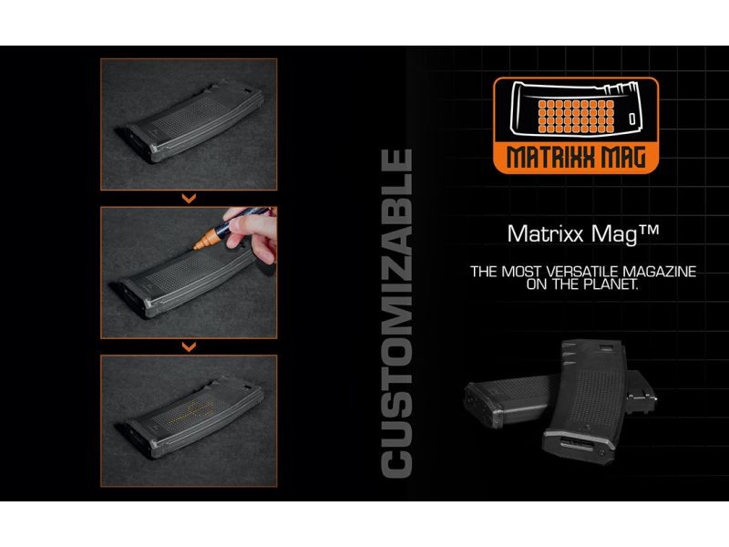 La Recon Superlite viene equipada de serie con el cargador Matrixx™ de 320 BB, considerado por muchos como el mejor del mercado. Su textura de matriz de puntos no solo permite una completa personalización, sino que también proporciona un agarre firme y seguro incluso con guantes. La forma especial de su parte frontal en la zona del mag-well actúa como un punto de tracción para recargas ultra rápidas incluso bajo estrés.
