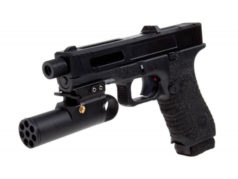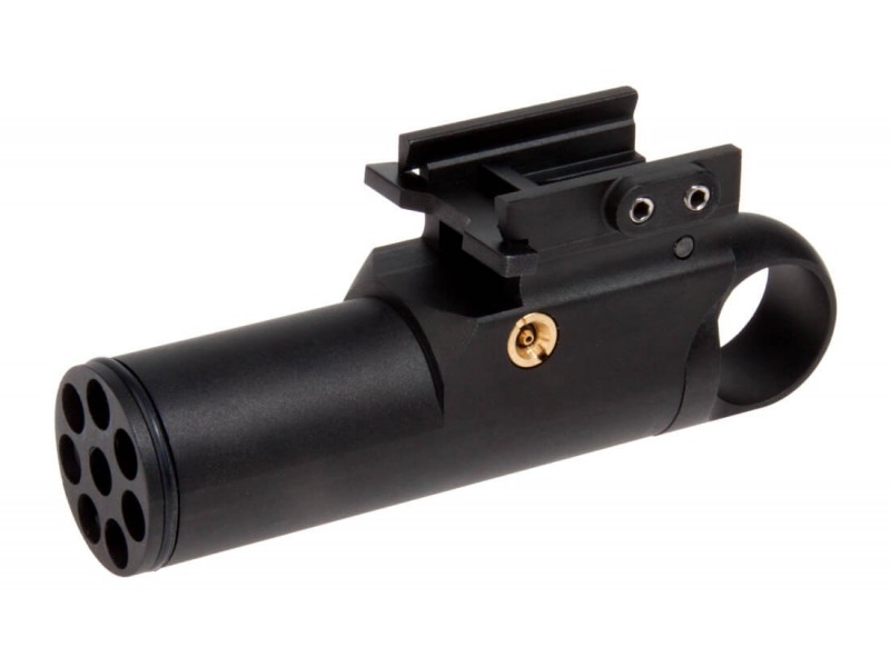 Construido en aluminio y alimentado por green gas, este lanzagranadas ocupa poco más que una linterna de pistola y podremos acoplarlo a cualquier sistema weaver o picatinny comodamente.