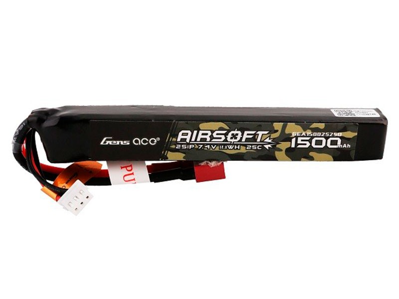 A bateria Gens Ace 25C 1500mAh 2S1P 7,4V Lipo para armas de airsoft com conector T foi concebida especificamente para alimentar armas de airsoft. Adequada para a maioria das AEG, como M4, CM16, SCAR, AR15 LE STOCK.