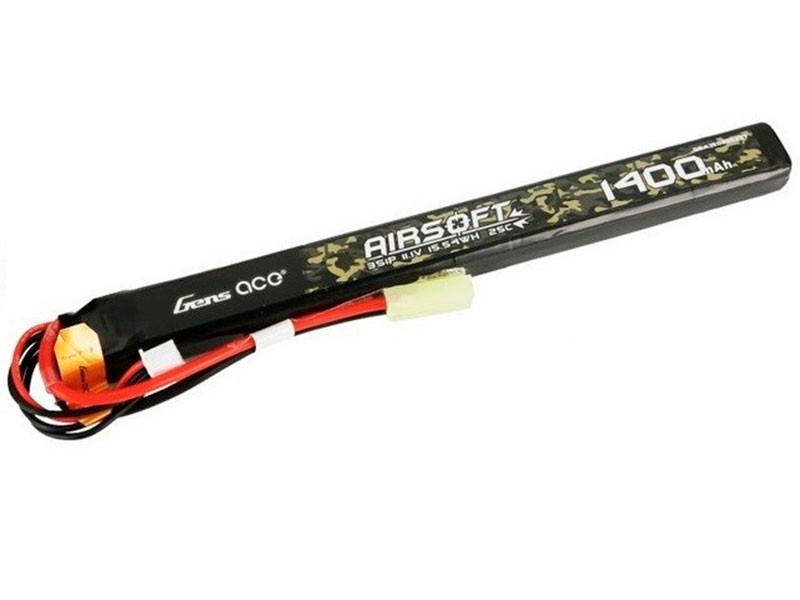 A bateria Gens Ace 25C 1400mAh 3S1P 11.1V LiPo para armas de airsoft com conector mini Tamiya foi concebida especificamente para alimentar armas de airsoft. Adequado para tubos de amortecimento e AEGs onde o espaço para baterias é limitado, sem sacrificar a potência, e compatível com coronhas LE como M4, etc.